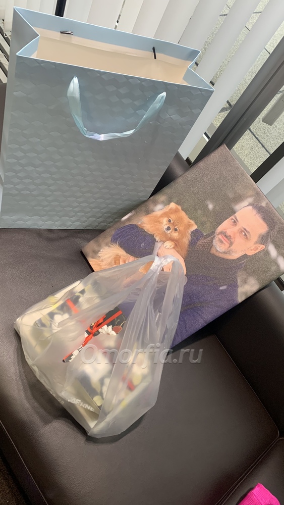 На следующий день, я хорошо выспалась и встала пораньше, чтобы все успеть, поехала с утра за сладким подарком для доктора) заказала набор эклеров и набор пирожных в Городских кондитерских номер 1 и в Омске мне распечатали картину на холсте, портрет Валерия Юрьевича с его собачкой Соней🥰♥️