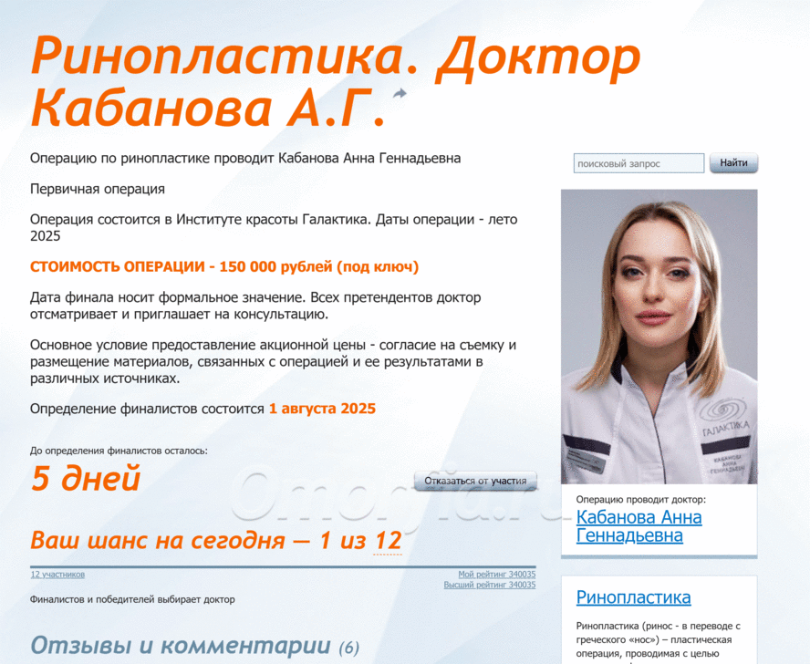 Так как я участвовала во всех акциях по рино, в том числе и с частичной оплатой, 18 июня мне поступило предложение приехать на консультацию к Кабановой А.Г.