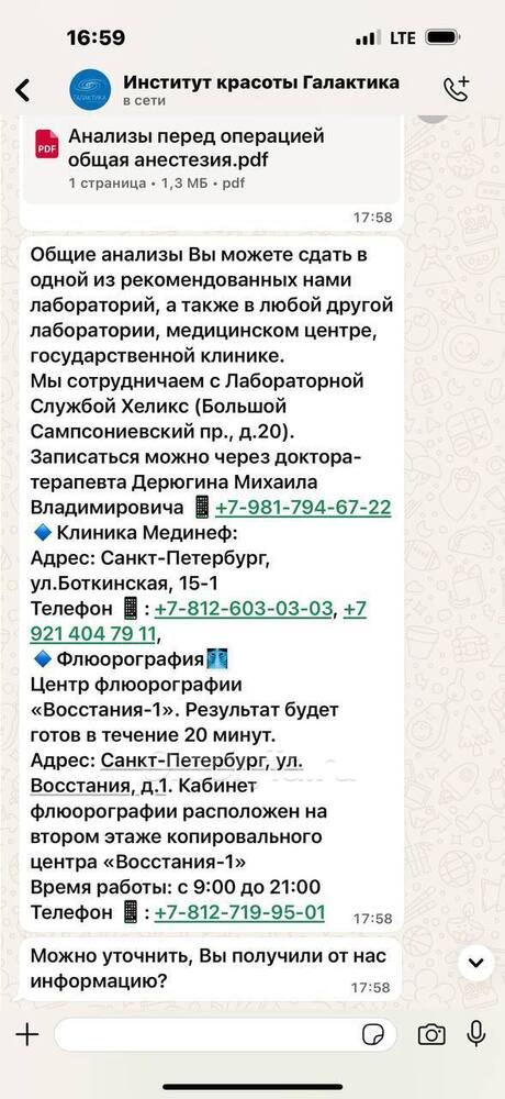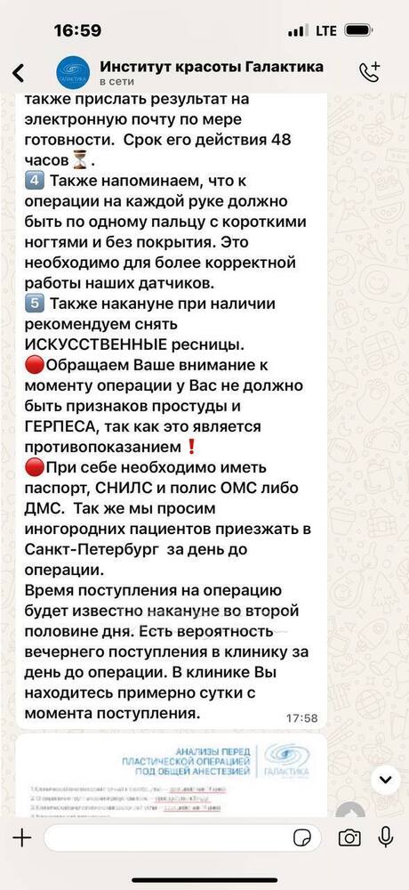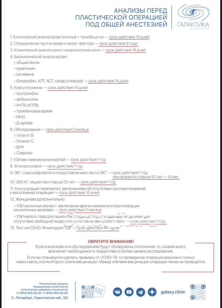 Получив заветное "письмо", хоть стало понятно, что от меня будет требоваться, ведь я никогда раньше не делала какие-либо пластические операции и я приступила к действиям. И позже, в переписке в администратором "Галактики", я получила совершенно идентичный список анализов. Но как говорится, предупрежден-вооружен.