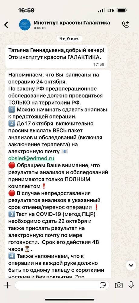 Но, без приключений у меня не обошлось🤣 За сутки до операции, мне написала Иришка, спросила как у меня настрой, собрала ли я сумку (сообщила, что может пригодиться и лучше взять с собой, только лишнего ничего не брать). И вот он момент, она спрашивает меня, не забыла ли я сдать тест на КОВИД? ТА ДАААММ... 24 число, время 12 ч. 41 мин. Как я бежала...У ф, успела, сдала, отрицательный. Тут же результат отправляю администраторам "Галактики". Ну все, ждем звонка, во сколько мне завтра (25.10) приезжать в клинику.