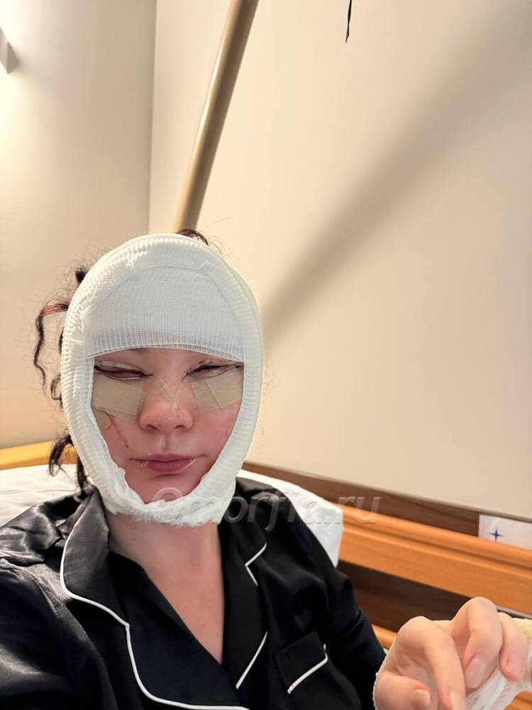 Вот так я выглядела вечером как проснулась. Кстати, мне не ставили в голову как всем дренажи, не знаю почему. Но крови на голове не было, когда я пришла в себя, голова была влажная, и подушка тоже. А под головой было одноразовое полотенце. Сложилось ощущение, что голову мне промыли.