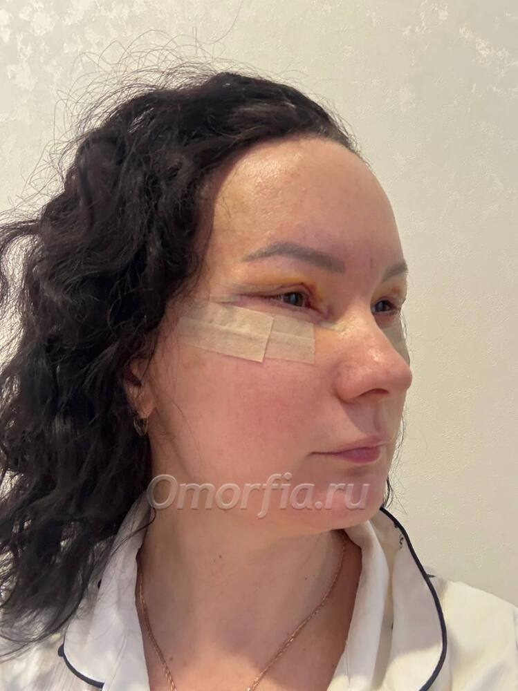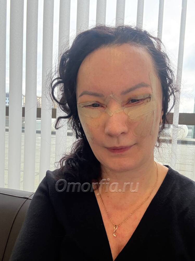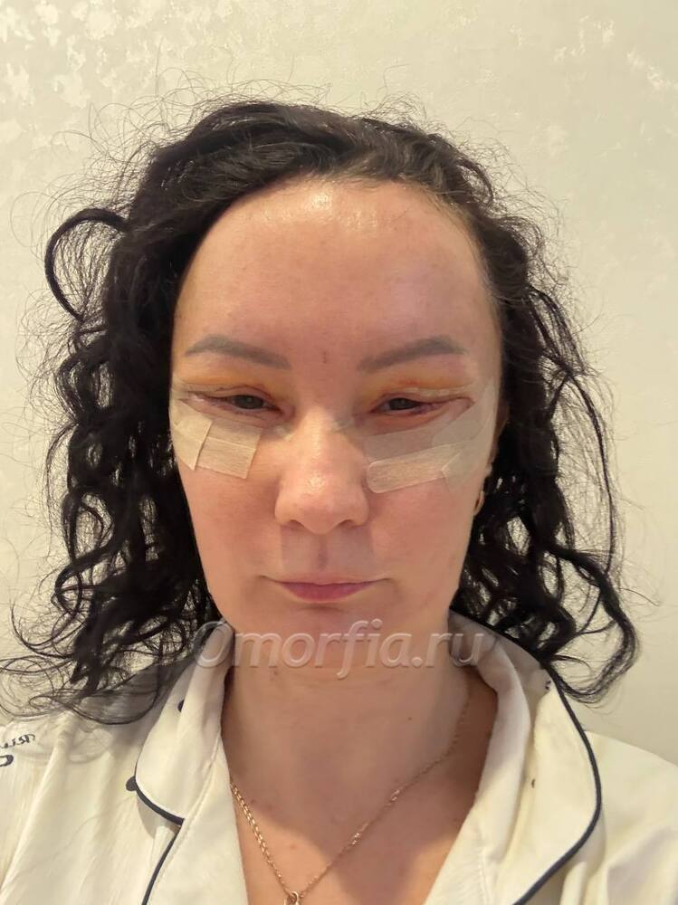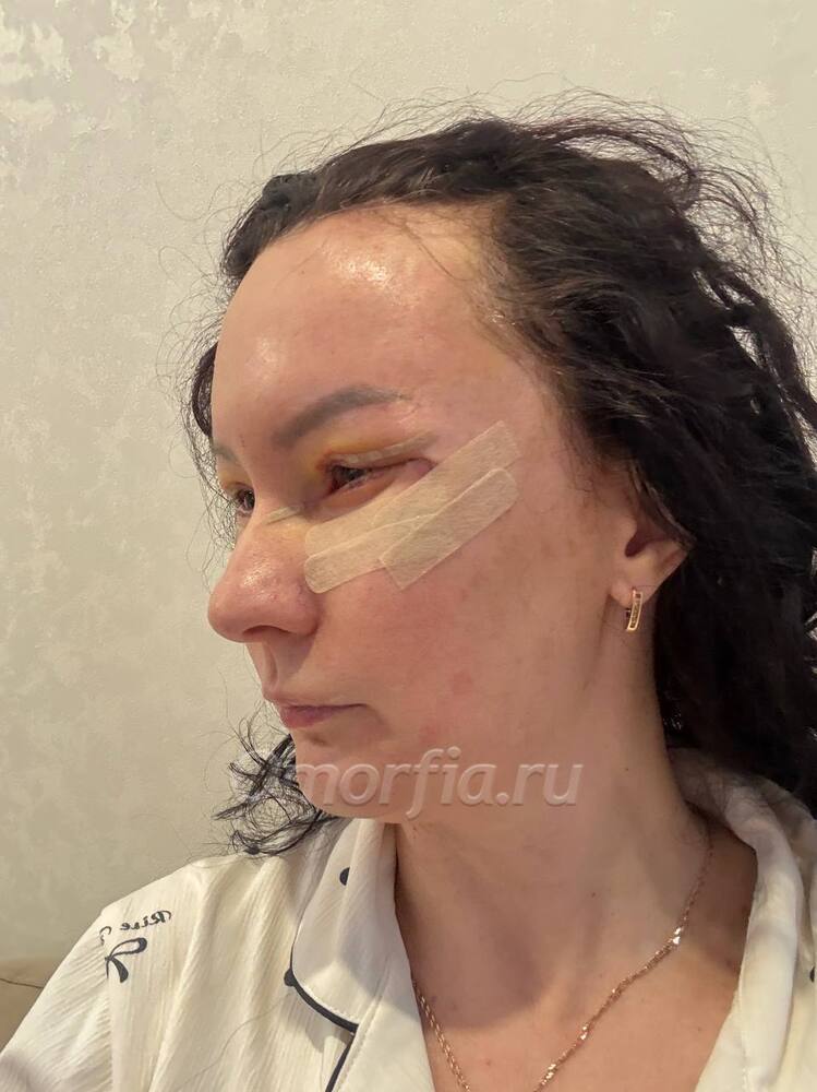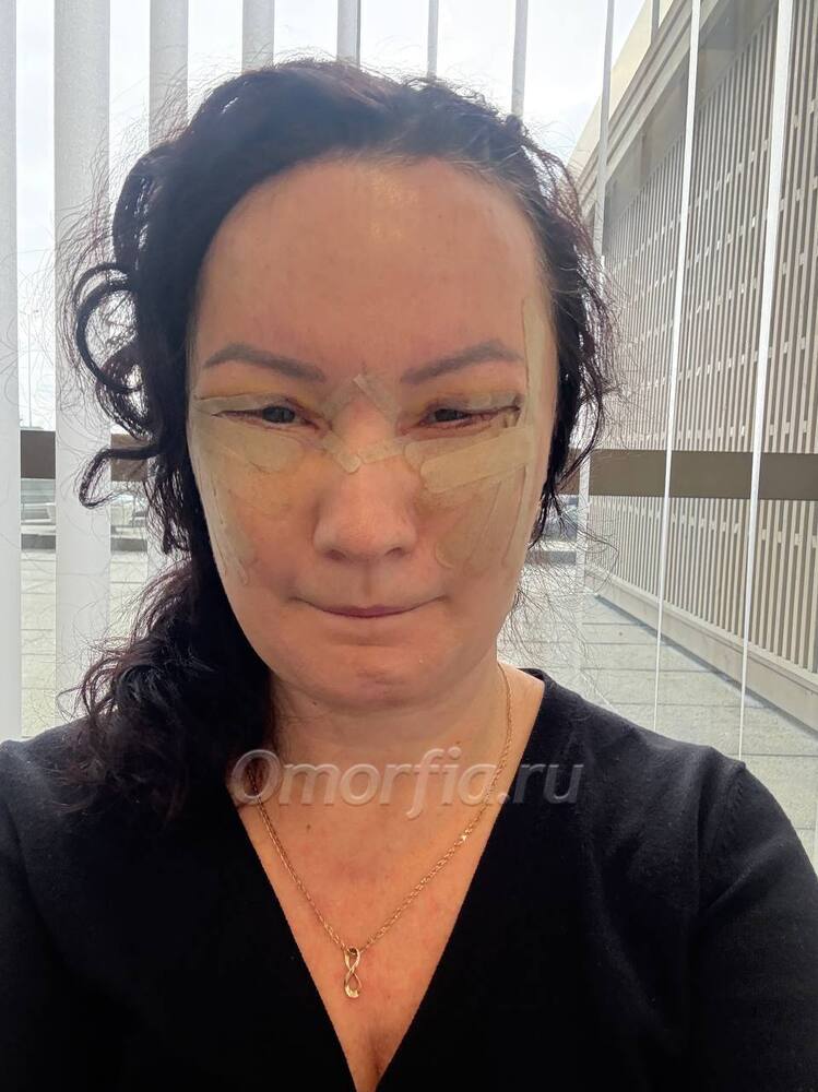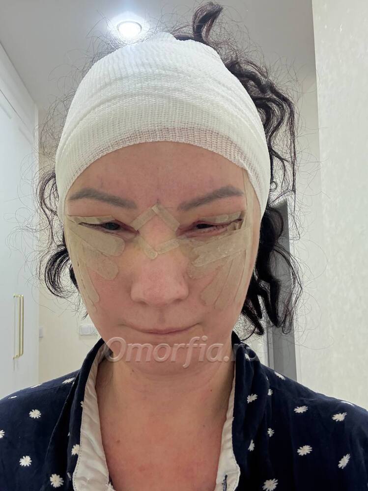 Из самой реабилитации: пик отека пришелся у меня именно на 2 день, болела голова, но было терпимо. Обезболивающее я принимала примерно1 раз в день. Что действительно было тяжело, так это смотреть, т.к. глаза еле открывались и больно врезались в веки наклеенные пластыри. Еще чувствовала боль почему-то в районе именно висков. Но меня не покидала мысль, что боль присутсвует именно из-за повязки, т.к. она сильно давит.