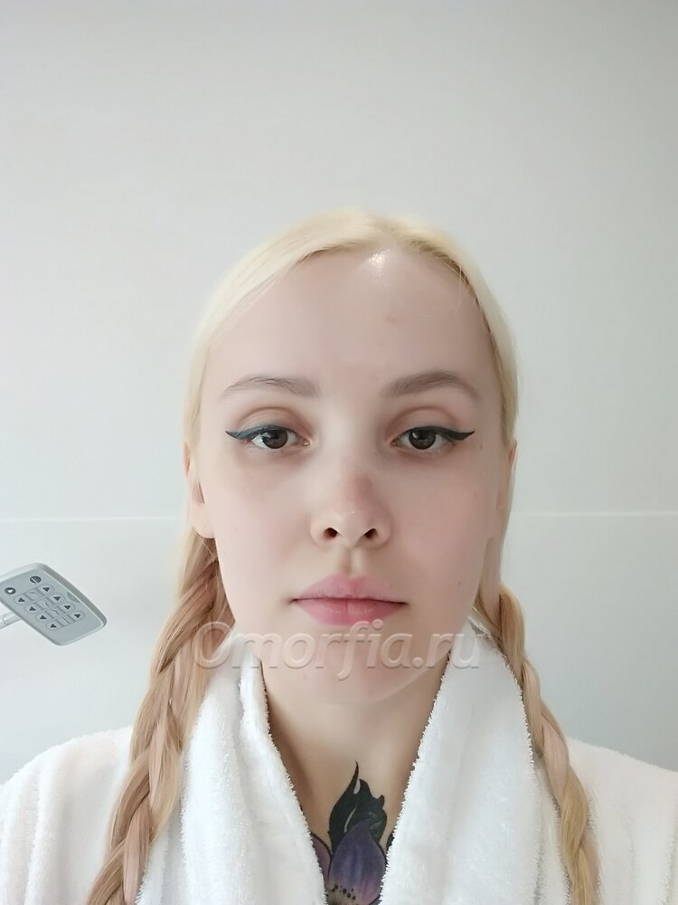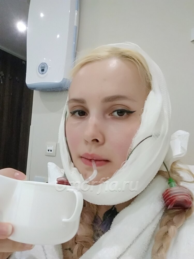 Позже ко мне заходил доктор Годин Григорий Вадимович, снова уточнил все мои пожелания по поводу формы, скачал что именно возможно сделать в моем случае. Форма зависит от расположения лицевых нервов, но мне сказали, что сделают максимально возможный результат к тому, который я показала на фото. Потом ко мне пришёл анестезиолог. Задал вопросы о здоровье. Я спросила как все будет проходить. Позже меня забрала прекрасная и чутка медсестра, поддержала меня при моём волнение перед наркозом. Мне ставят наркоз, я говорю три фразы и засыпаю) Проснулась я сама примерно через 2 часа. Не было ощущения того, что я не понимаю где я. Все было хорошо. Не было боли, которую я так боялась, не было тошноты. Ко мне заходил доктор, но в первый раз я не смогла открыть рот и ответить. Был отёк подбородка и губы. Я отвечала только знаками. Через пару часов я смогла отвечать уже медсестрам .