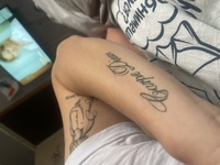 Уйти с поля битвы я уже не могла ....Я скулила, вздыхала, потела, скрежетала зубами, проклинала татуировщика который рассказывал мне как он делает себе тату на живую и чувствует лишь приятную щекочущую боль! Мазохист фигов! Потом пришла маникюрша и спросила может ли она присоседится к нам и закончить маникюр? Всё равно я сидела т.к. он набивал уже сзади. Мастер дал добро и она села и затрещала без умолку. К концу третьего часа я уже привыкла к боли и отчуждённо слушала звук машинки и болтовню маникюрши... Наконец всё закончилось! Смотреть было больно т.к. нужно было смотреть через плечо...Глянула я мельком, я же ему уже доверяла)))) Фотки сделала дома, фоткала внучка и фото- так себе...