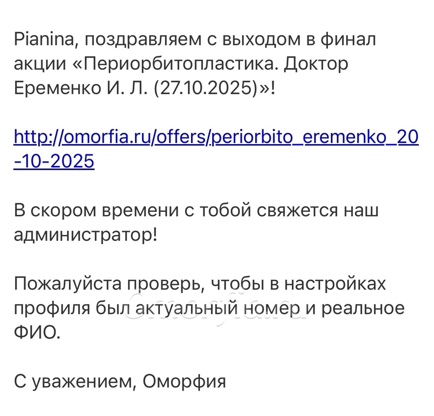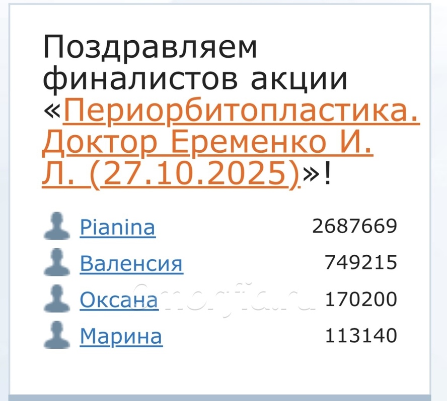 Мой выход в финал был предсказуем, так как рейтинг довольно высокий. И я знала что выйду по первому месту. Поэтому, у меня не получилось прочувствовать в полной мере все те эмоции волнения и надежды, которые испытывали другие участницы акции.:) Второй этап ожидания, кого- же выберет из финалистов доктор, гораздо переживательней.Как и все финалисты, получила на почту сообщение о выходе в финал. Я была на втором месте по общему рейтингу. Забыла сделать фотографию, но нашла в табличке финалистов акции. . На моей страничке рейтинг уже немного обвалился.:) Сейчас стоит другая цифра, так как у участников, которые выходят в финал по первому месту, срезают какое-то количество процентов рейтинга, не помню точно сколько. Изначально, я хотела сделать блефаропластику, но потом увидела акцию по омоложению у доктора Свиридова, и подумала: почему бы и нет?! И вступила в нее. Но акцию перенесли на год. Это очень печально. А у меня уже нет возможности ждать так долго, потому- что состояние глаз выводит меня из равновесия, и лишний раз в зеркало не хочется смотреть, уже не говорю о том, что давно не фотографируюсь, поэтому я решила вступить в акцию периорбитопластики у доктора Еременко Ирины Леонидовны. Мне очень нравятся ее работы и я ей полностью доверяю. Кому, как ни ей- врачу- офтальмологу, офтальмохирургу. Глаза, это то, что особенно сейчас нуждается в омоложении. Почти 10 лет назад Артур Владимирович Рыбакин пригласил меня на свой мастер класс, где провел «Омоложение лица и шеи». Операция называлась так: