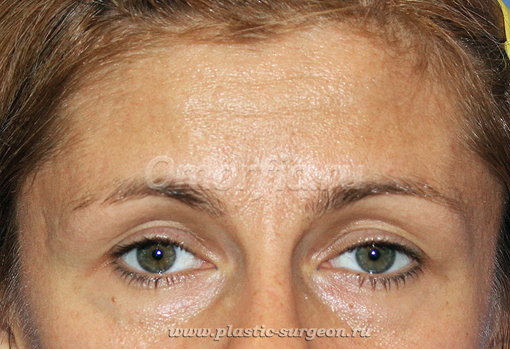 П ринято решение о выполнении эндоскопического лифтинга латеральных концов бровей через небольшие разрезы, сделанные в височной области волосистой части головы. Это даст нам эффект приоткрывания углов глаз и устранит усталый, грустный вид. Дополнительно - липофиллинг морщин лба с последующим введением ботокса в позднем послеоперационном периоде.