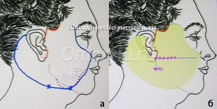 Рис. 1. Схема проведения подтяжки лица и шеи по W . Little : а – синим цветом обозначена зона отслойки кожи, б – уровень пликации SMAS .