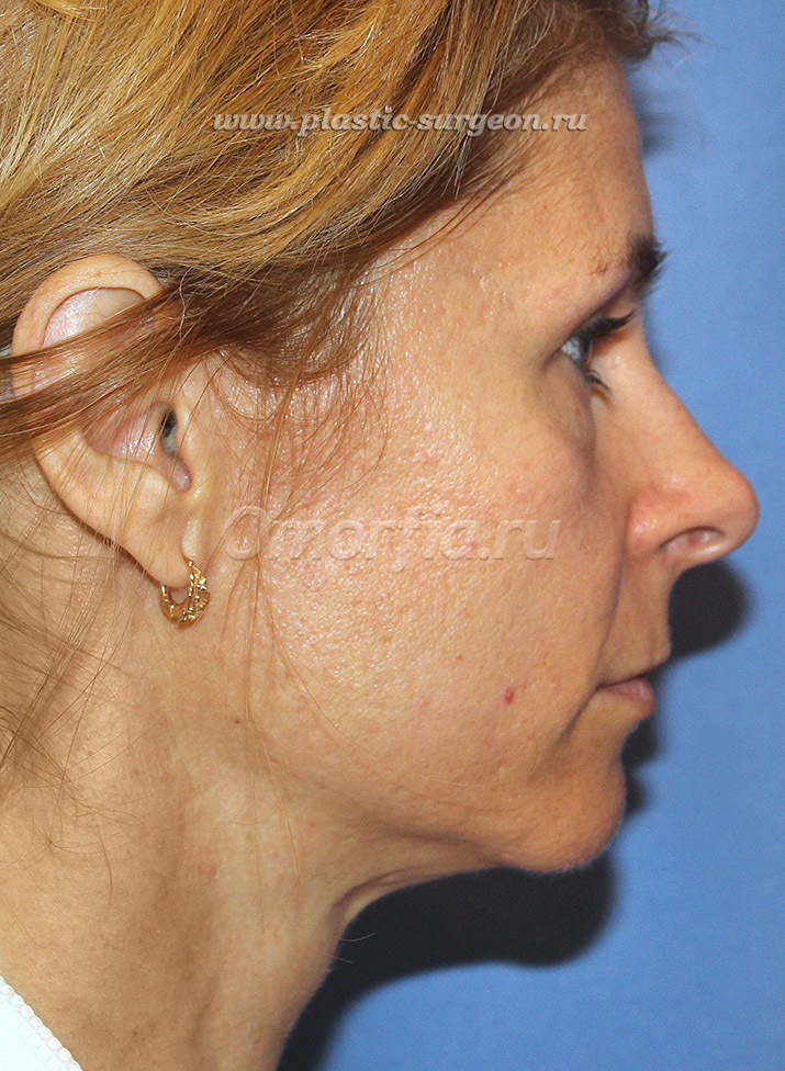 К роме птоза мягких тканей лица, появившихся излишков кожи, выраженных складок и морщин, у нашей пациентки атоничная, пористая, со сниженным тургором кожа с сеточкой мелких морщинок вокруг глаз, на коже верхней губы, в области под подбородком.