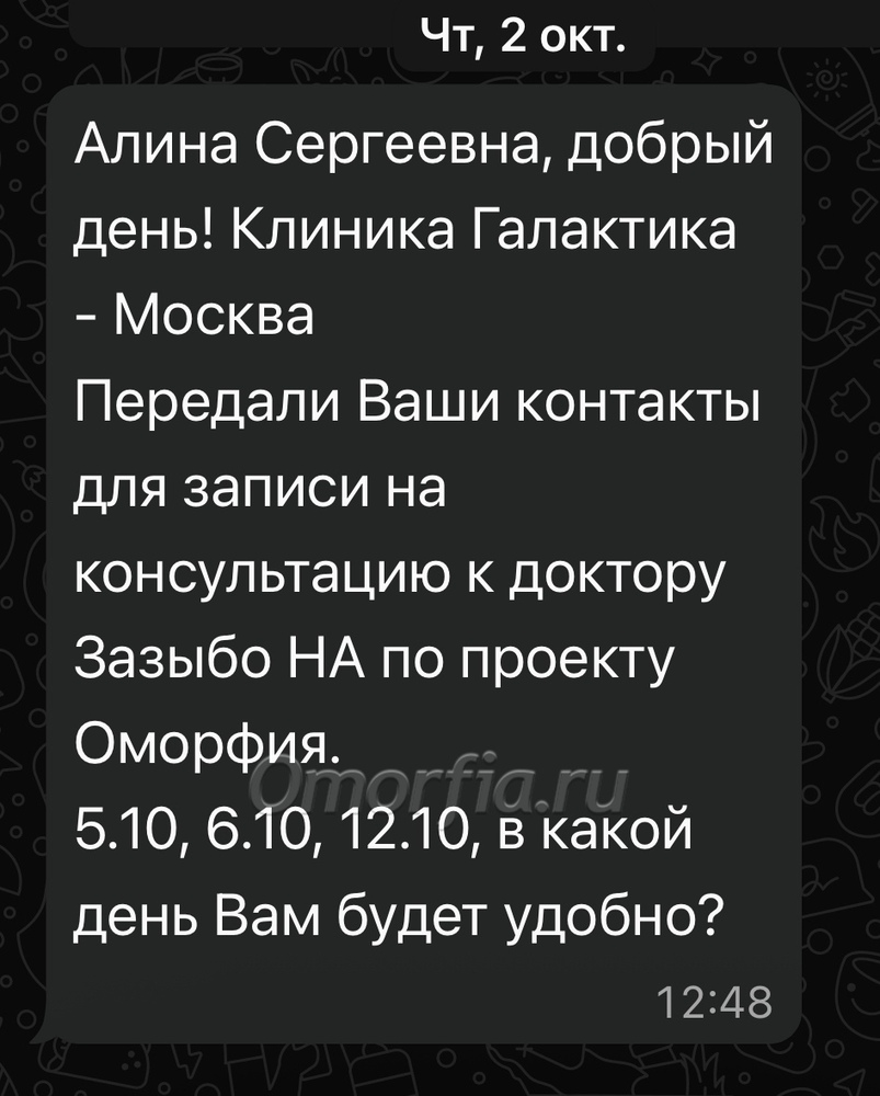 Зато из клиники «Галактика» уже связались со мной и согласовали дату консультации. Я выбрала консультацию в онлайн формате, так как приехать лично на консультацию нет возможности.