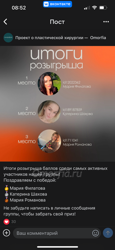 Мария, добрый день! Прошу начислить баллы за первое место за комментарии ВК сентябрь. Написала в личку группы.💖🙏